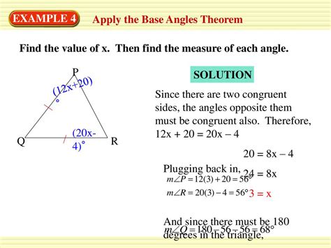 Another method to find the measurement of the base angle is to use the properties of similar triangles. If we have two similar triangles, we can set up a proportion between the corresponding sides of the triangles and solve for the unknown angle using trigonometry. This method is particularly useful in solving problems involving right triangles, where we can use the ratios of the sides to determine the measurements of the angles.